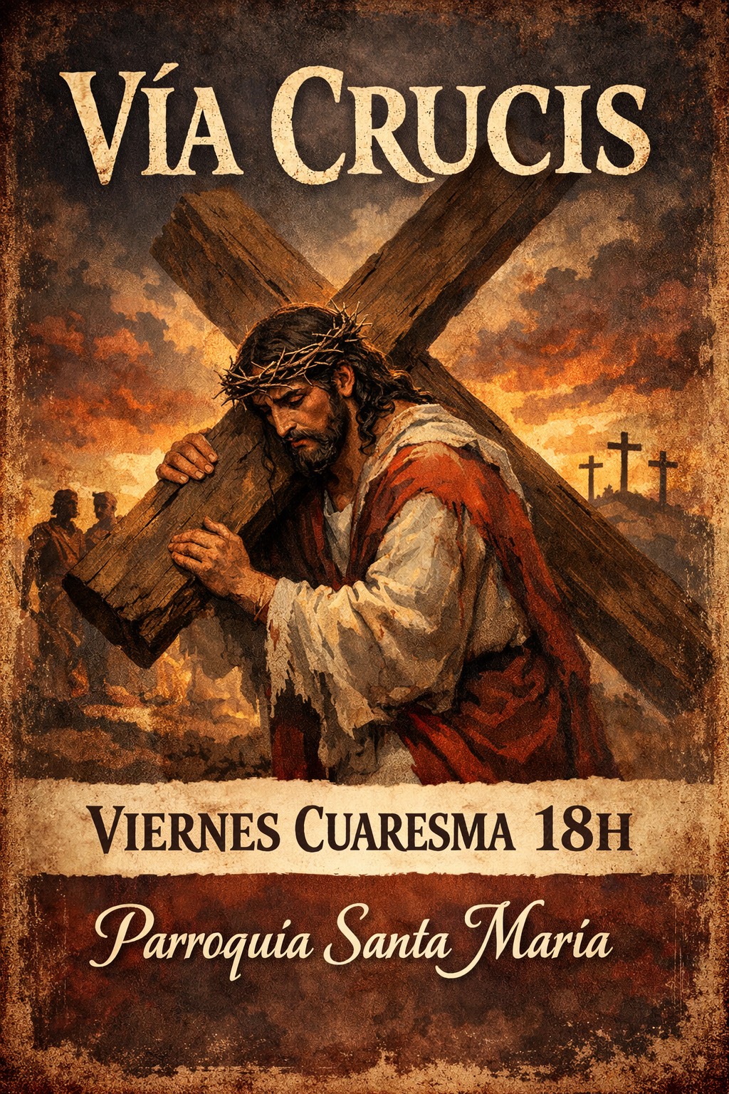 Durante el tiempo de Cuaresma, cada viernes a las 18:00h celebraremos el Vía Crucis en la Parroquia Santa María. Acompañemos al Señor en el camino de la Cruz, meditando su Pasión y renovando nuestra fe. Invitamos a toda la comunidad a participar en este momento de oración y recogimiento propio de este tiempo litúrgico.